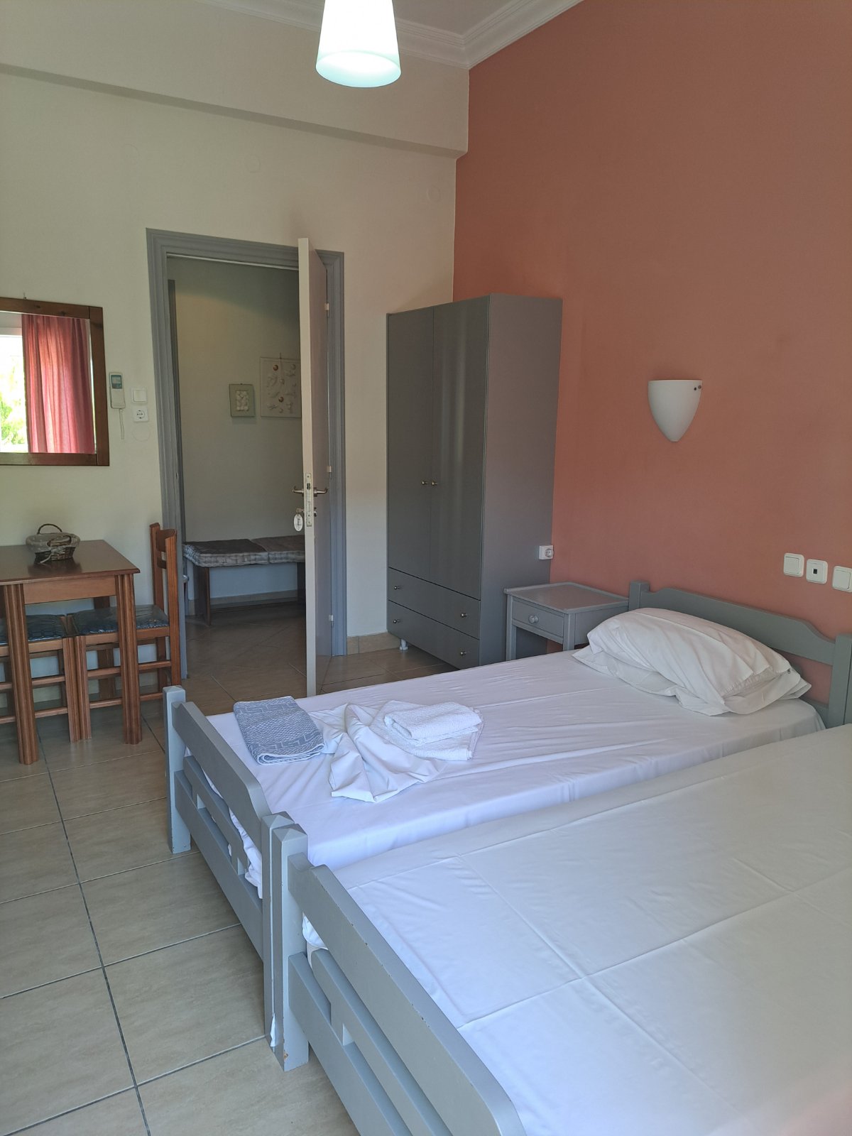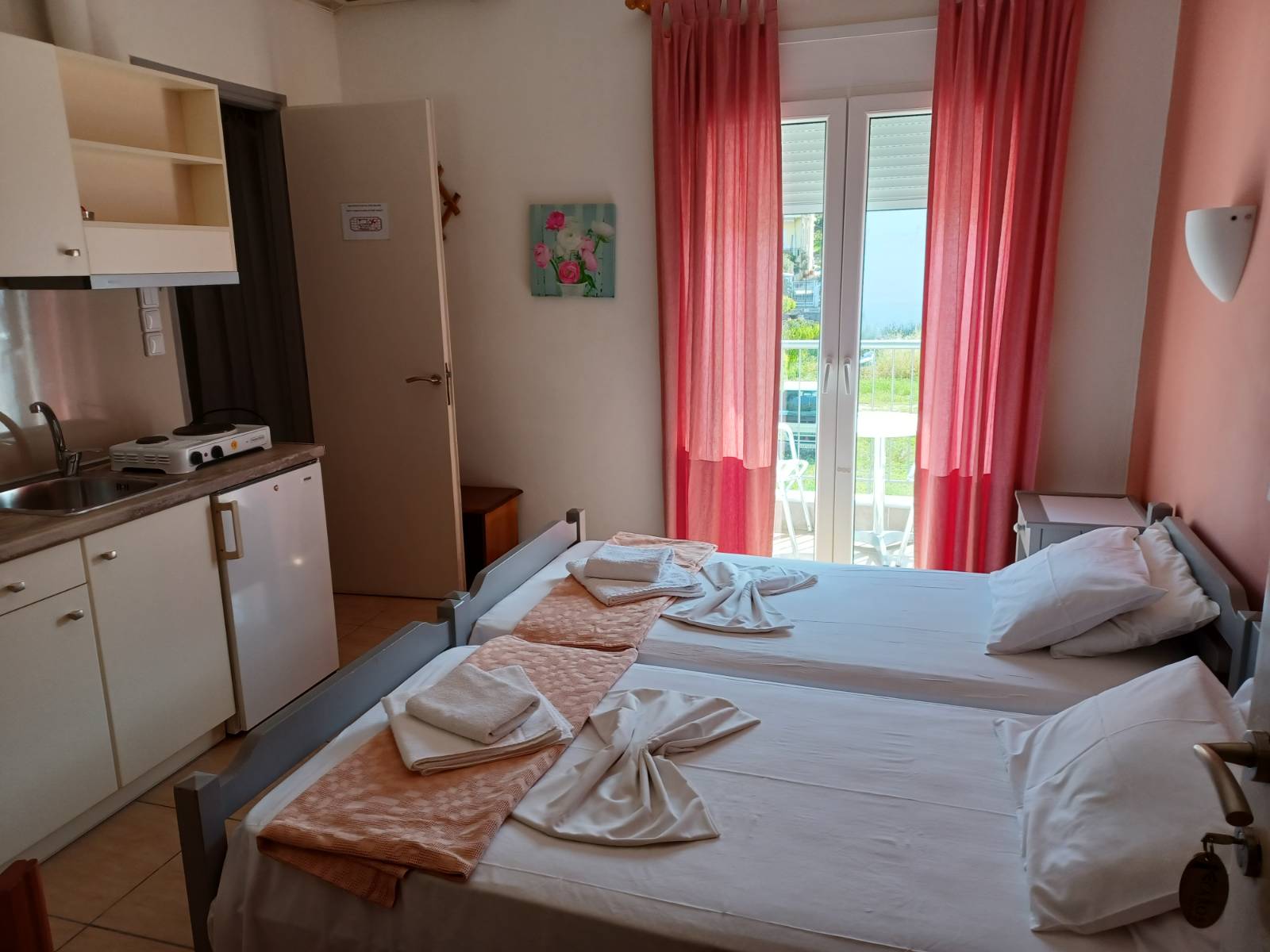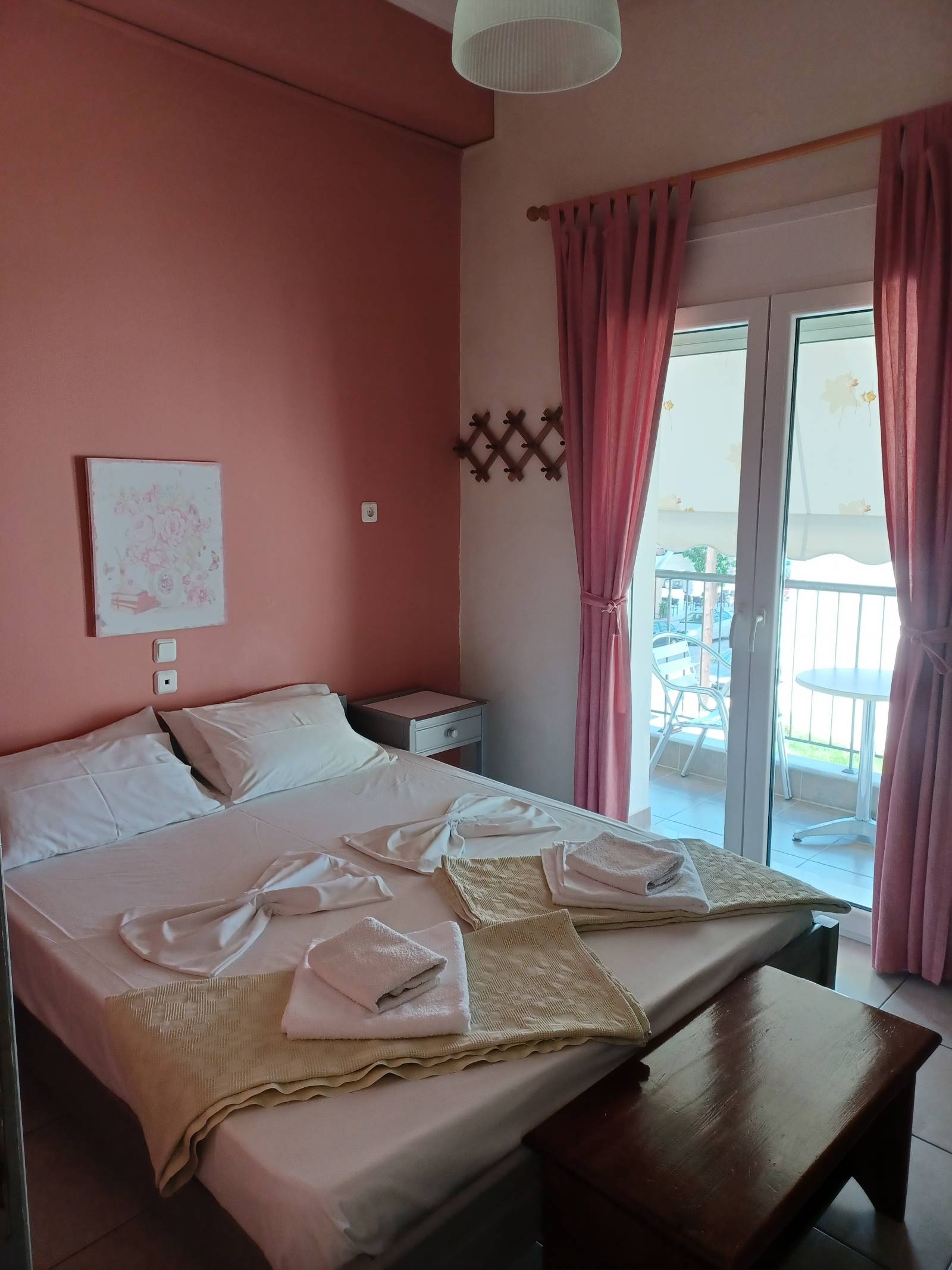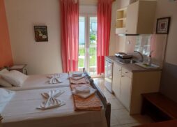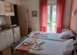 VILA FAROS- hotel apartmanskog tipa nalazi se na približno 60 metara od najbliže plaže i centra, dok je do plaže sa termalnim izvorima udaljen oko 800 metara.Sadrži lift, recepciju i manji lobi. Svi studiji i apartmani opremljeni su klima uređajem (doplata 3€ dnevno), Wi-Fi internetom (uključenim u cenu) i TV-om.