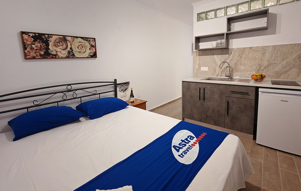 Oprema: Svi studiji i apartmani imaju terasu, wc i tuš sa toplom i hladnom vodom, sto i stolice, orman, kuhinju sa frižiderom koja je opremljena prema broju osoba (tanjiri, čaše, šolje, escajg, šerpa, tiganj, djezva za kafu). Promena posteljine je na pola smene, za smene duže od 7 noći. Domaćini kuća na dan zamene posteljine dostavljaju čistu posteljinu koju gosti sami menjaju kao što i sami održavaju higijenu apartmana tokom svog boravka. Pored standardne opreme apartmani mogu imati odredjenu opremu koja ih izdvaja u odnosu na ostale apartmane iz ponude. U cenovnicima se pored naziva određenih kuća nalaze brojevi. Brojevi su konkretni brojevi određenog studija ili apartmana koji se u određenom smislu razlikuje u odnosu na studije/apartmane istog tipa u okviru kuće. To se može odnositi na veličinu ili lokaciju terase, kao i na prostranost samog apartmana, zbog koje i postoji razlika u ceni u odnosu na ostale iz određene kuće. Molimo goste da ponesu svoje peškire, s obzirom da peškiri nisu deo standardine opreme studija/ apartmana.