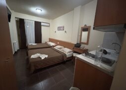 Vila je potpuno renovirana 2013. godine. Studiji i apartmani su komforni i potpuno opremljeni (čajna kuhinja, frižider, klima uređaj, LCD/TV sa satelistskim Total Tv programom – 9 srpskih kanala). Vila raspolaže dvokrevetnim, trokrevetnim I četvorokrevetnim studijima, I dvokreventim, trokrevetnim I četvorokrevetnim apartmanima. U prizemlju vile se nalazi bar sa salonom i recepcija. Dvorište vile je veoma lepo uređeno sa garniturama za sedenje, koje gosti mogu da koriste. Preko puta same vile se nalazi super market “Mytikas”, a u neposerdnoj blizini su taverne, picerije, kafići, poslastičare, prodavnice… Vilu preporučujemo kako za porodice, tako i za veća društva. Doplata za klimu je 5 € po danu.