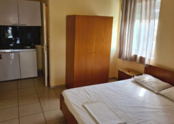 Vila Stelios je starijeg datuma i sastoji se od četvorokrevetnih apartmana na visokom prizemlju i studija na prvom spratu. Nalazi se u centru letovališta na oko 80 metara od mora. Dvokrevetni, trokrevetni i četvorokrevetni apartmani na visokom prizemlju sadrže kuhinju sa trpezarijskim stolom i jednim standardnim ležajem, spavaću sobu sa francuskim i standardnim ležajem, kupatilo sa tuš kadom i veliku natkrivenu terasu sa garniturom za sedenje i pogledom na dvorište. Veličina apartmana je cca 25 kvm + terasa. Opremljen je sa wi – fi Internetom, TV-om, mrežom za komarce i klima uredjajem (uključen u cenu) u spavaćoj sobi. Četvorokrevetni studio na prvom spratu sadrži kuhinjski deo, francuski ležaj i dva standardna ležaja na sprat, kupatilo sa tuš kadom i veliku natkrivenu terasu sa garniturom za sedenje i bočnim pogledom na more. Veličina studija je cca 24 kvm + terasa. Opremljen je sa wi – fi Internetom, TV-om, mrežom za komarce i klima uredjajem (uključen u cenu). Ono što posebno izdvaja ovaj studio i čini ga izuzetno atraktivnim i interesantnim, je velika ugaona terasa (oko 15 kvadrata), sa prelepim bočnim pogledom na more. Vila Stelios je B kategorije, nema peškire, a parkiranje je moguće na ulici pored vile.